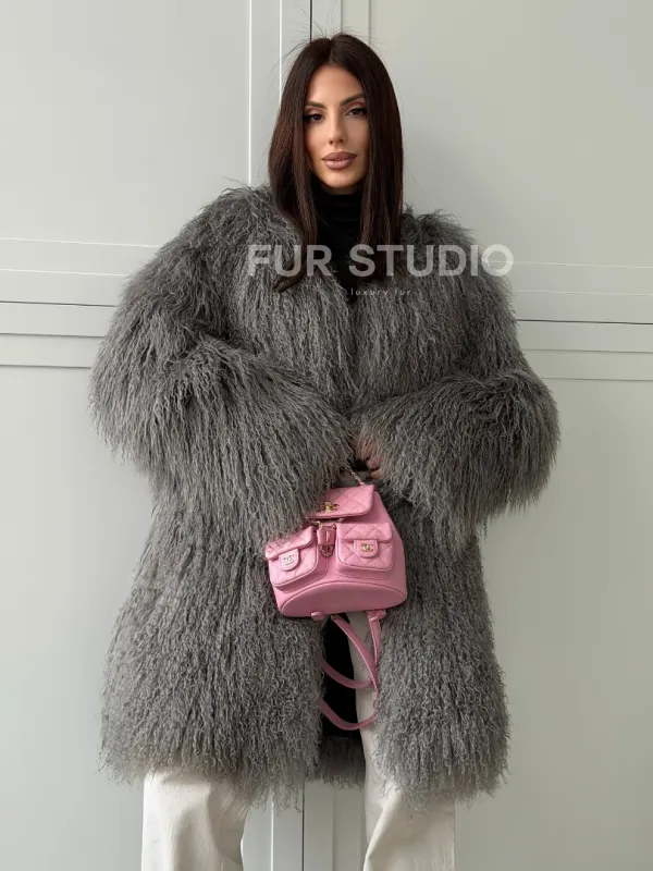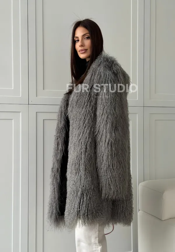 Удлиненная серая шуба из ламы 102810